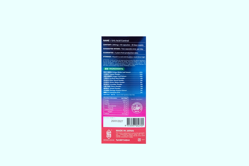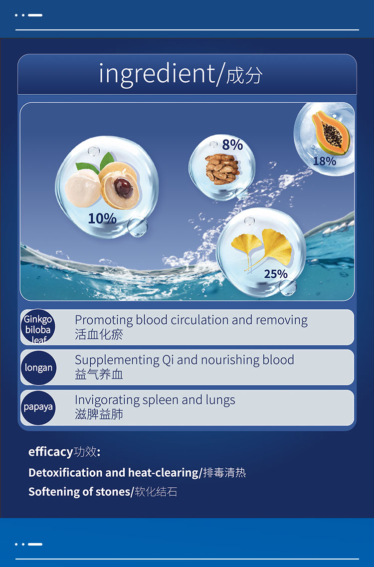 Ginkgo biloba leaf extract 25%; Papaya powder 18%; Longan meat extract 10%; Burdock powder 8%; Bitter melon powder 8%; Winter melon powder 6%; Cucumber powder 6%; Cherry powder 6%; Tomato powder 6%; Plantain 5%; Coenzyme Q10 2%