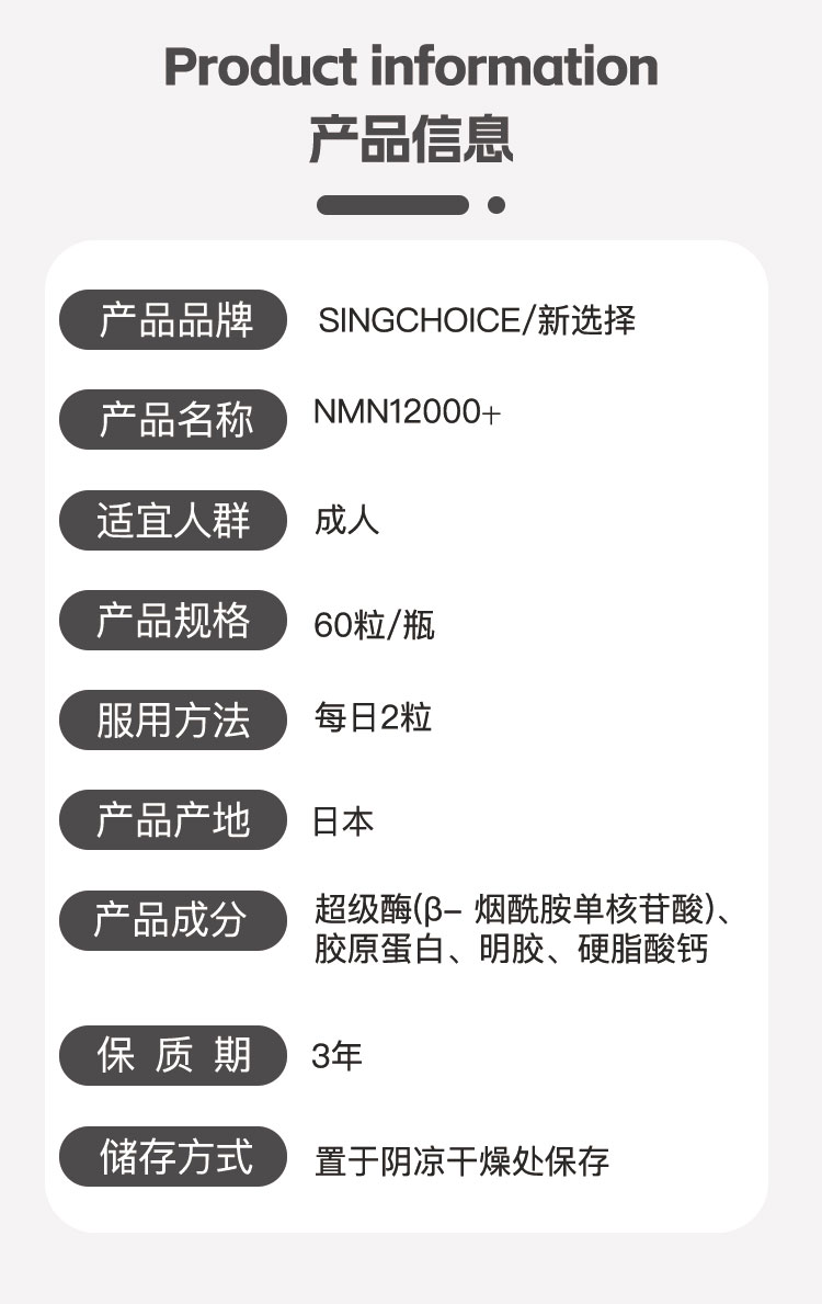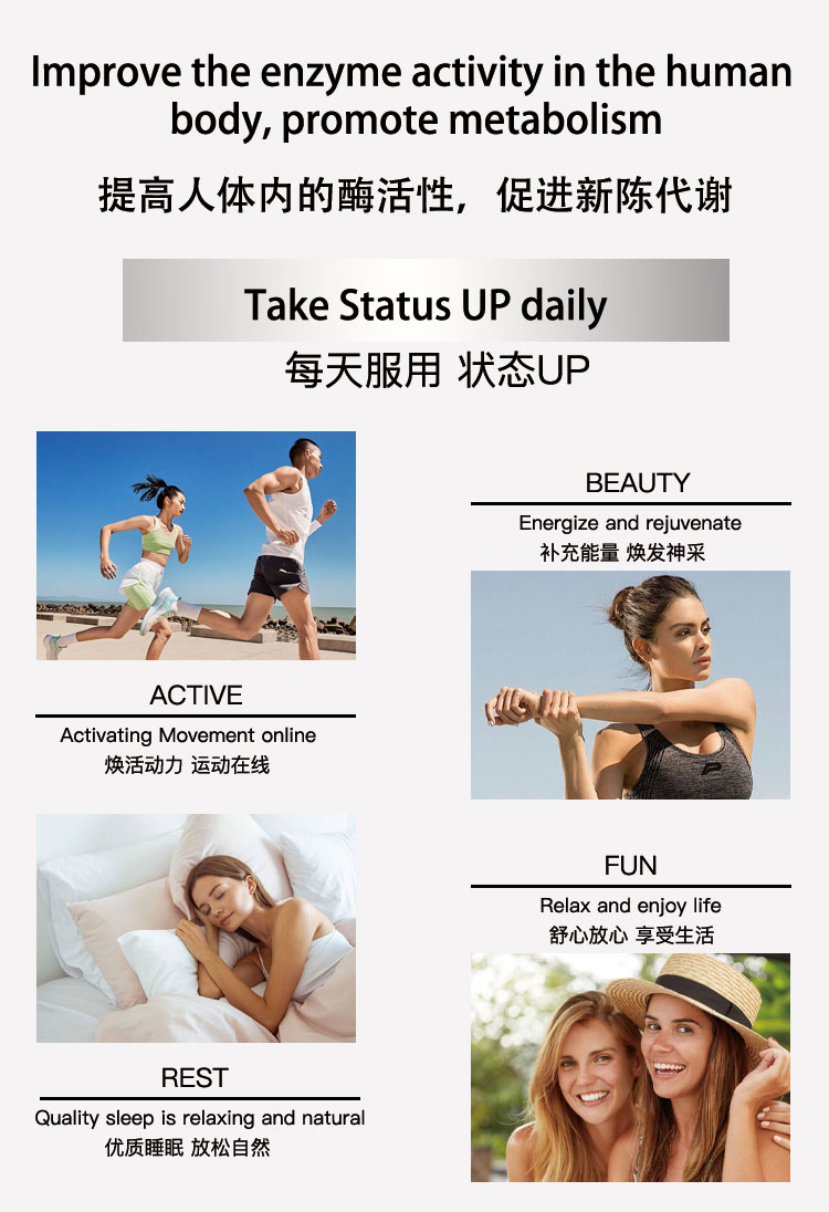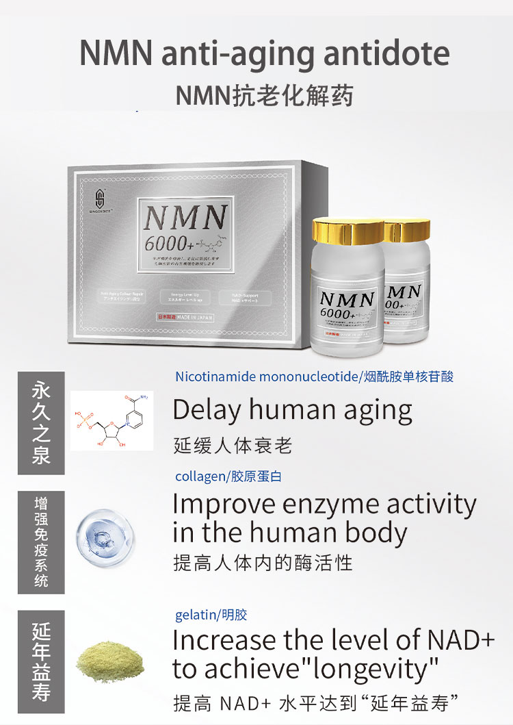 Main Ingredients:NMN superenzyme (β - nicotinamide mononucleotide);Enzyme essence (Capsule layer ingredient) Plant fiber
